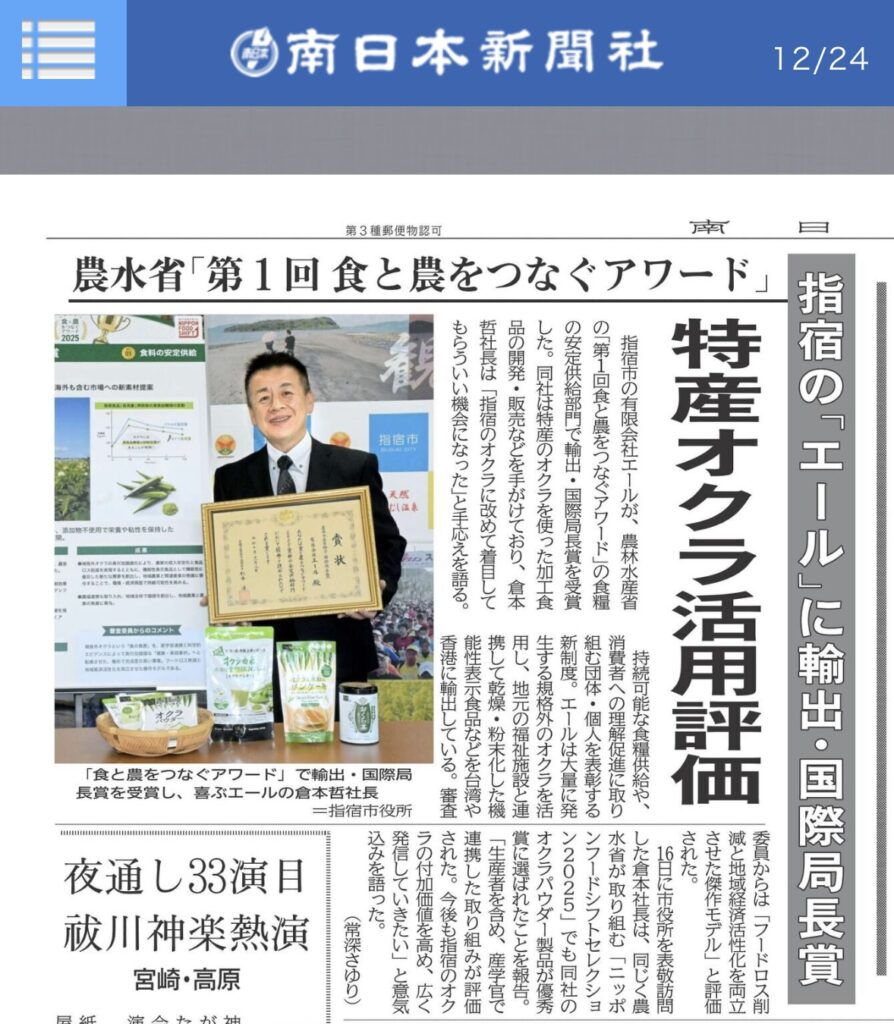今回の受賞は、地元産オクラを活用した機能性食品の開発と、海外を含む新市場への展開が評価されたものです。
